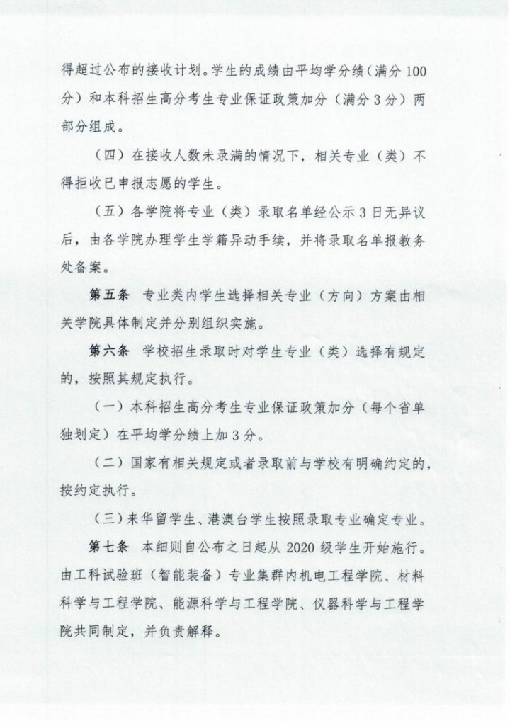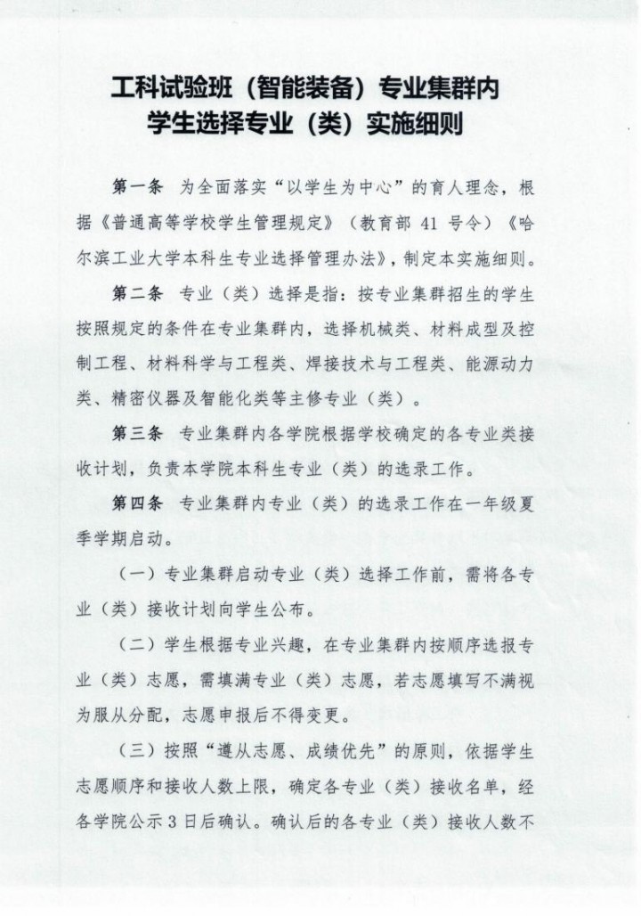 哈尔滨工业大学 工科试验班(智能装备)专业集群内学生选择专业(类)实施细则