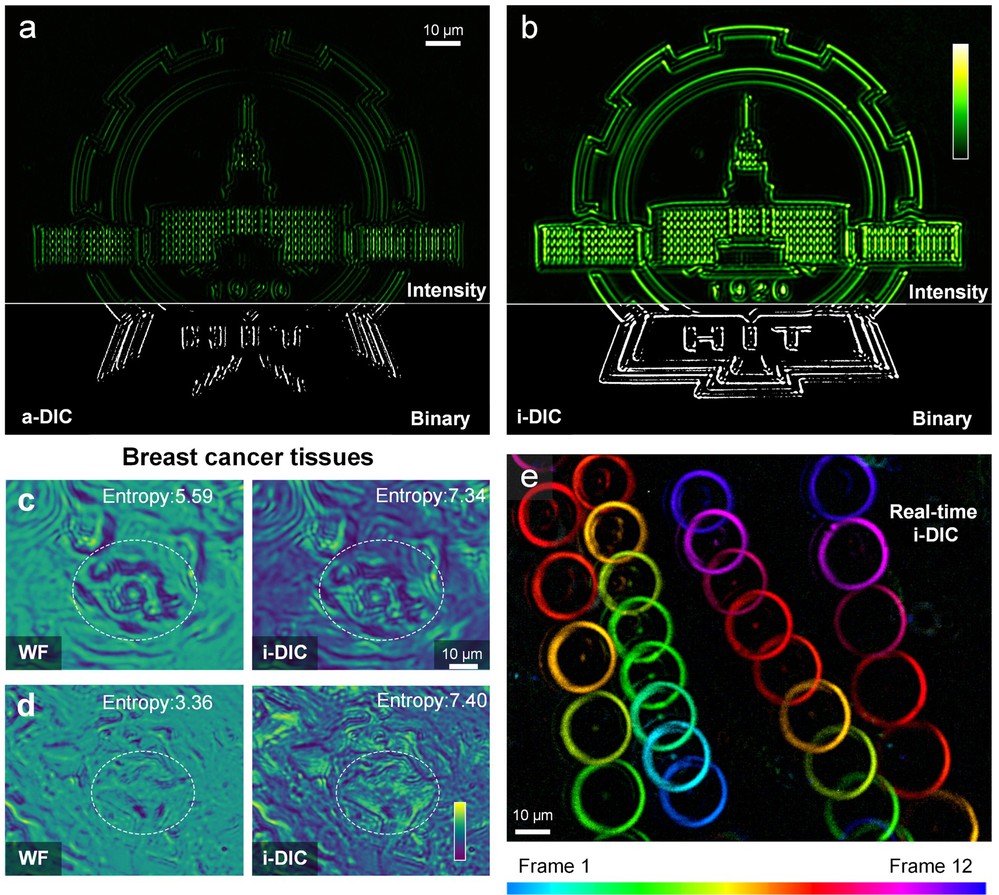 图2 成像结果展示。(a)-(b)透明样品(哈工大LOGO)在各向异性DIC(a-DIC)和各向同性DIC(i-DIC)显微镜下的成像结果对比,(c)-(d)乳腺癌组织在宽场显微镜(WF)和各向同性DIC(i-DIC)显微镜下的成像结果对比,(e)运动的二氧化硅微球在各向同性DIC(i-DIC)显微镜下粒子追踪结果。