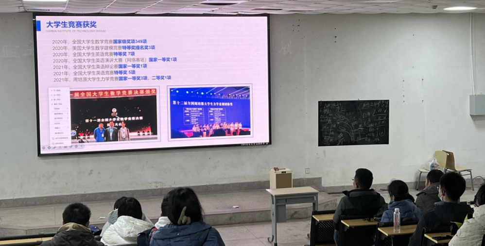 2月1日中午,成员们在学校礼堂进行宣讲。通过短视频带同学们了解了哈尔滨工业大学的学习生活环境;张毅麟同学总体介绍了哈工大一校三区的布局及各自特色;郑博同学介绍了校本部的概况及录取条件,以及未来技术学院的培养特色;汪小晶同学介绍了威海校区的美丽景色、院校综合情况和各专业分数线及招生政策;纪宣妤同学介绍了威海校区的科研经费、得奖项目以及特色招生政策;吴雨泽介绍了深圳校区的一流学科专业、优越就业环境、顶尖教育资源、优秀青年名师、缤纷校园生活以及招生情况。最后,建立了咨询群聊以便后续学校宣传和高考后学生根据分数段咨询报考。