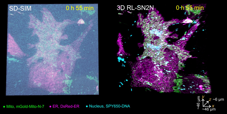 研究团队还使用所开发的方法在SD-SIM系统上成功实现了分辨率高达90纳米的五维(xyz-颜色-时间)长时程活细胞超分辨成像。该技术揭示了在整个细胞有丝分裂过程中内质网(洋红色)、线粒体(绿色)和细胞核(青色)之间的动态组学互作,监测时间超过3小时,为生物学家进一步探索细胞器的功能和相互作用关系提供了重要的实验依据(图片2)。