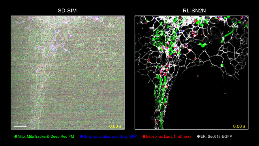 研究团队将SN2N方法进一步结合解卷积技术(RL-SN2N)提高分辨率,并应用于基于转盘共聚焦超分辨显微系统(Spinning Disk Confocal Structured Illumination Microscopy, 以下简称SD-SIM),实现了清晰的四色活细胞成像(图片1)。SN2N使得快速而复杂的细胞器动态过程得以可视化,通过对不同细胞器的轨迹和空间分布进行详细记录,追踪多个细胞器之间的相互作用事件,深入探索细胞器之间的协同作用和相互作用关系。