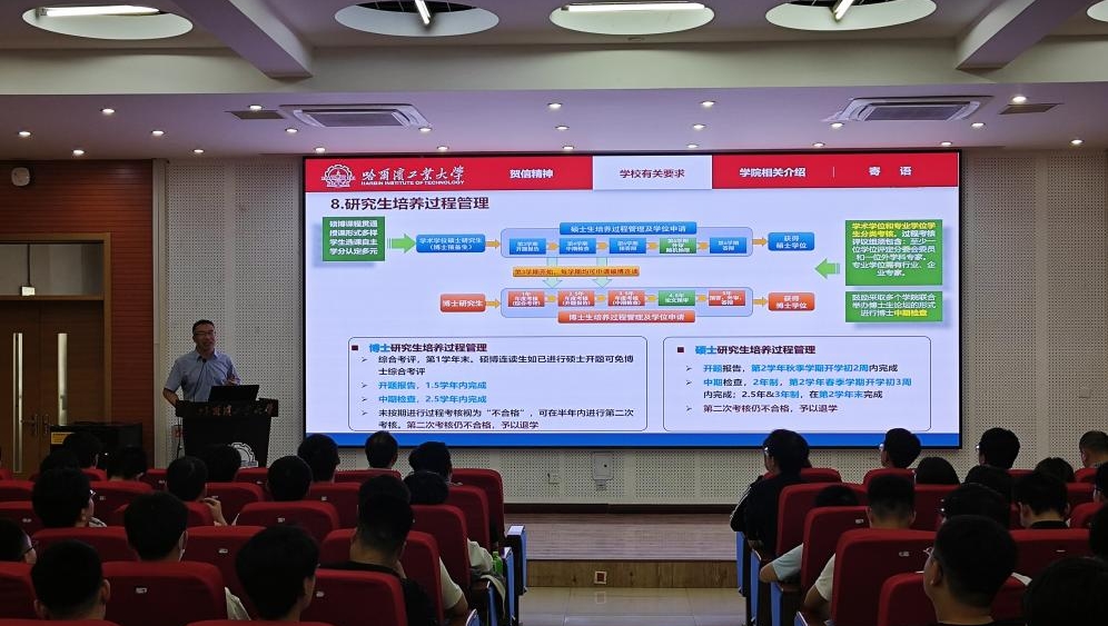 接着,副院长陆振刚教授从学院的历史沿革、机构组成、师资队伍、学术方向、人才培养、未来展望等多个方面细致介绍了学院当前的基本情况,使同学们对7M体育 有了更深刻的了解;随后,陆院长介绍了研究生培养过程中的相关要求,详细解读了学业年限要求、培养过程管理、培养计划、学位论文要求和毕业要求等具体内容,陆院长鼓励同学们锚定个人追求与国家事业的交汇点,通过自身的努力为强国建设、民族复兴作出新的更大贡献。