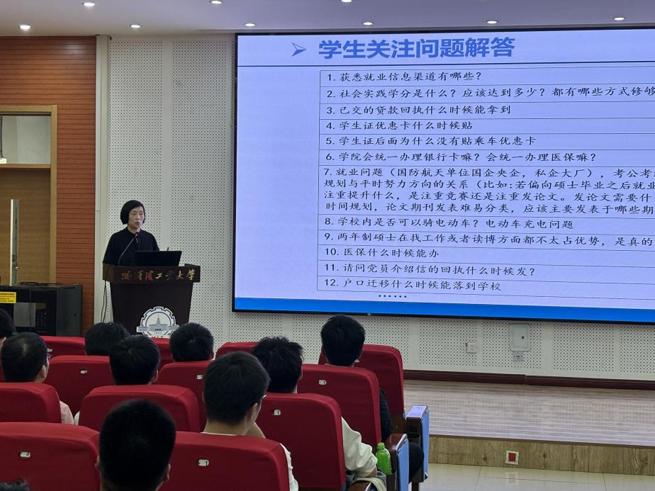 7M体育 院办主任丁惠敏老师从生活和学习的角度提供了具体建议,她鼓励新生勇敢面对挑战,主动适应环境,并积极融入学院的科研团队。丁老师从培养年限、学籍管理、课程选择、必修环节、学位管理、奖助学金和推荐攻博几个方面对同学们普遍关心的问题进行了说明,并且提醒研究生新生利用好在校时间,努力学习。